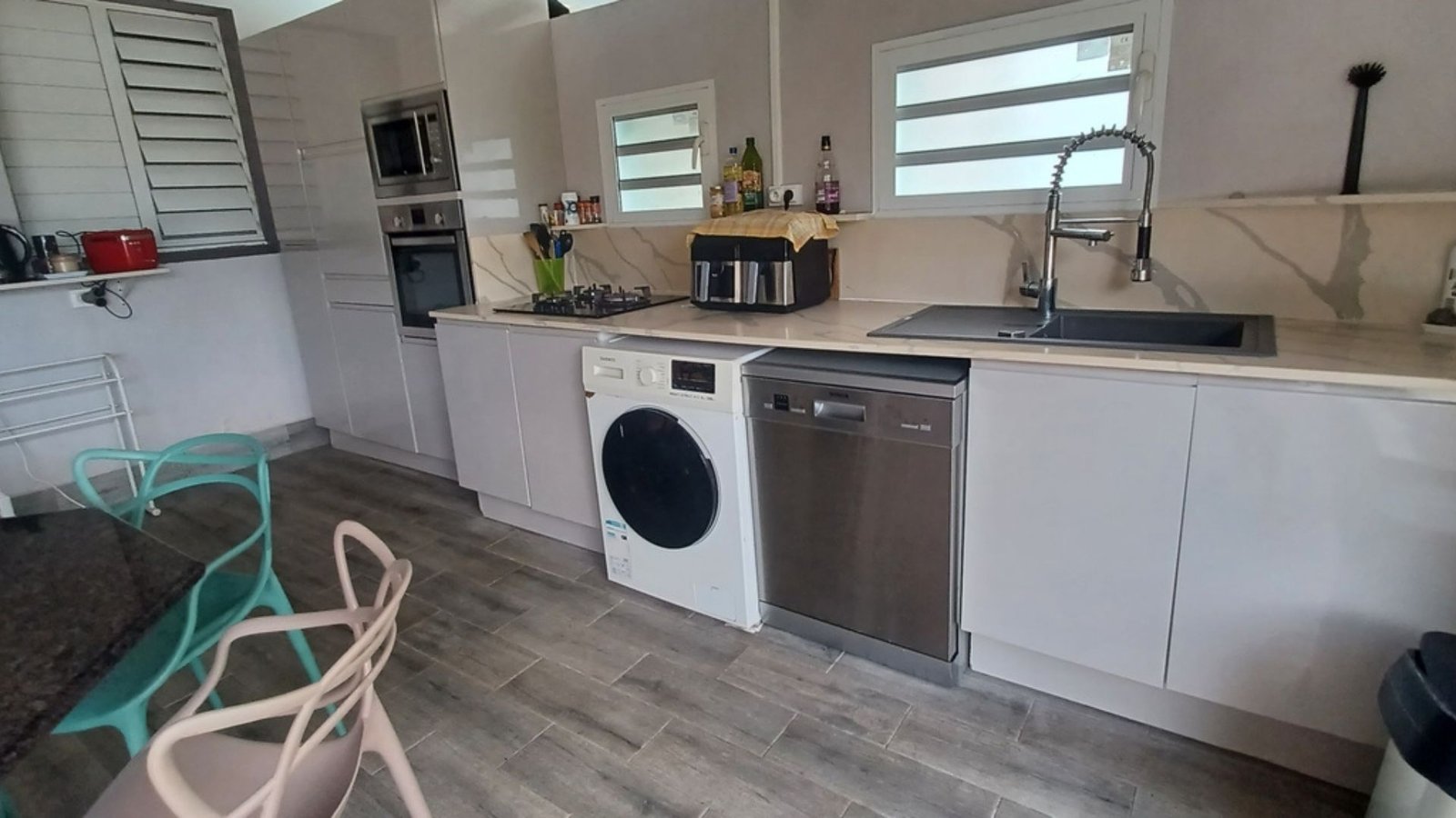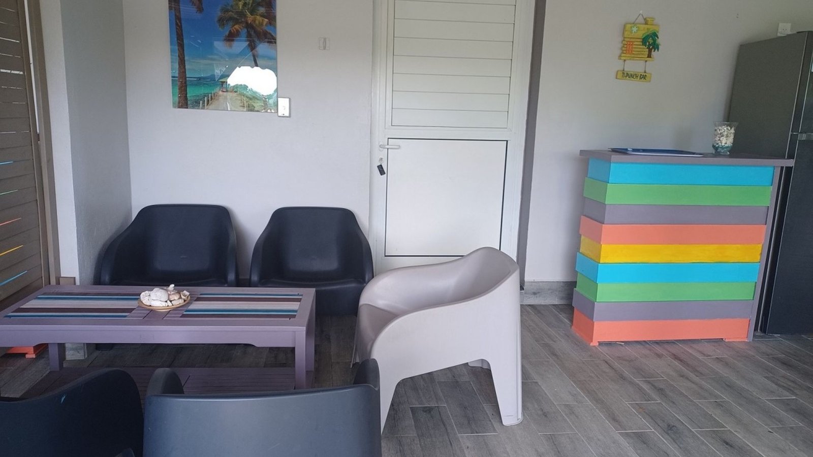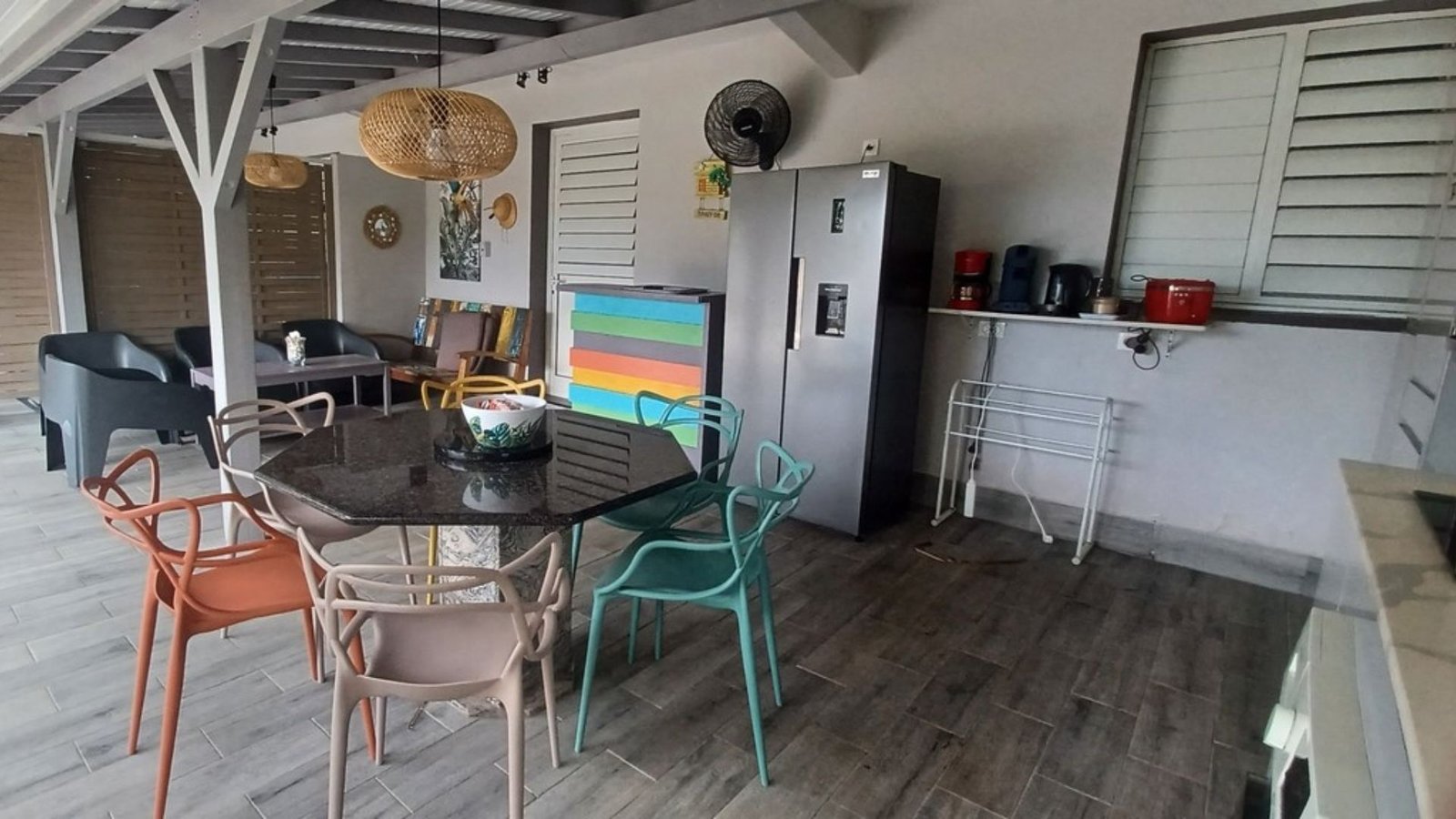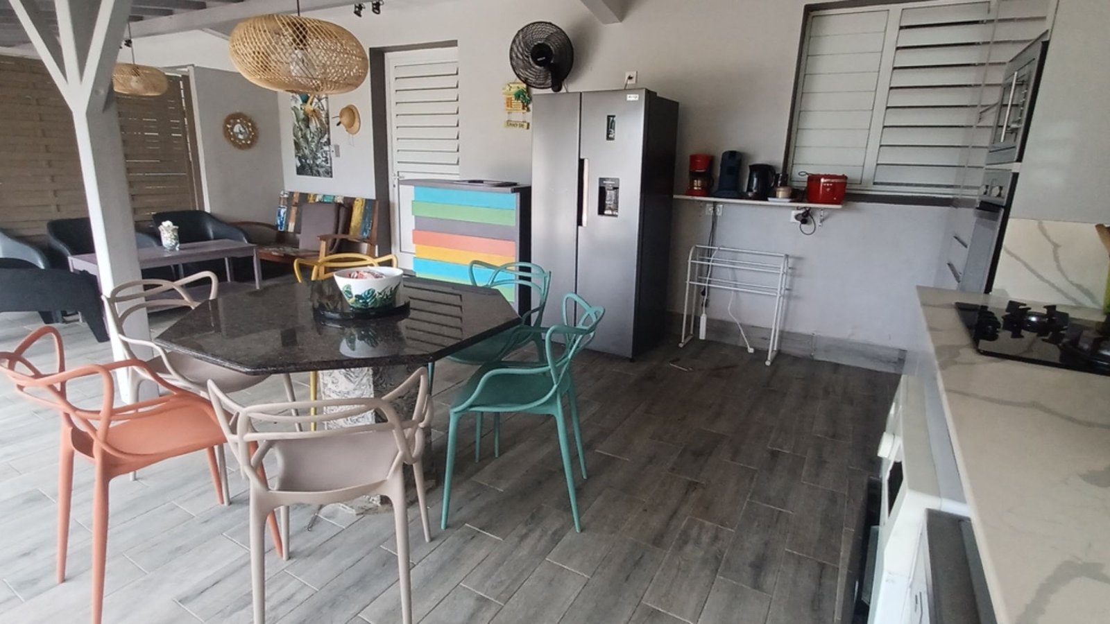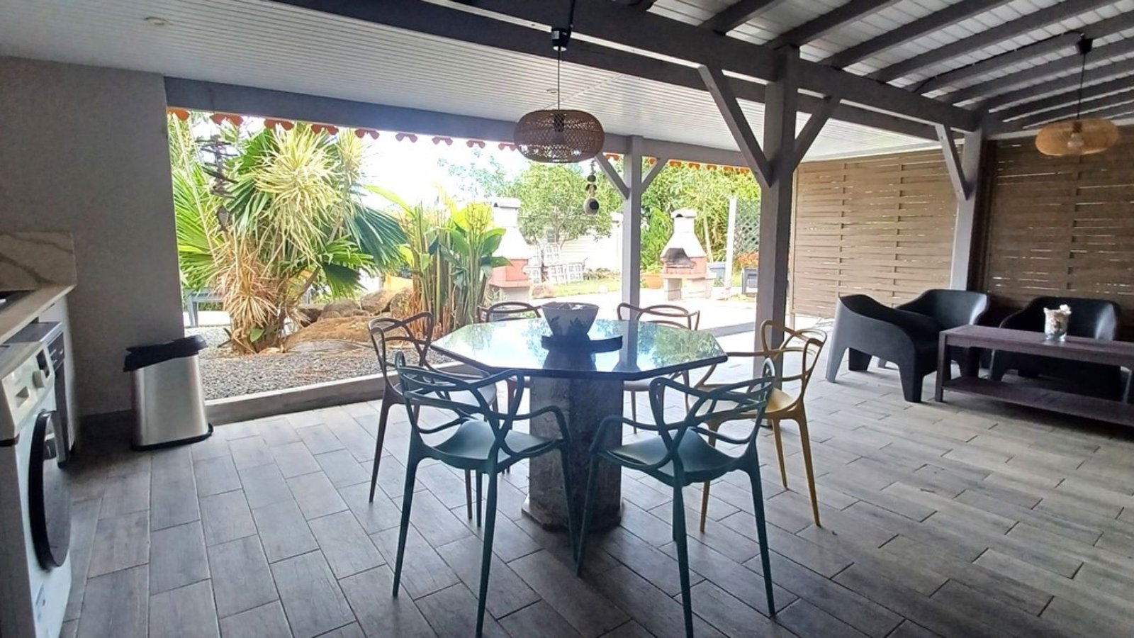 Son grand salon lumineux, sa terrasse couverte de 42 m² et son cadre verdoyant créent un environnement propice à la détente, aux repas en plein air et à des vacances tropicales en toute liberté.