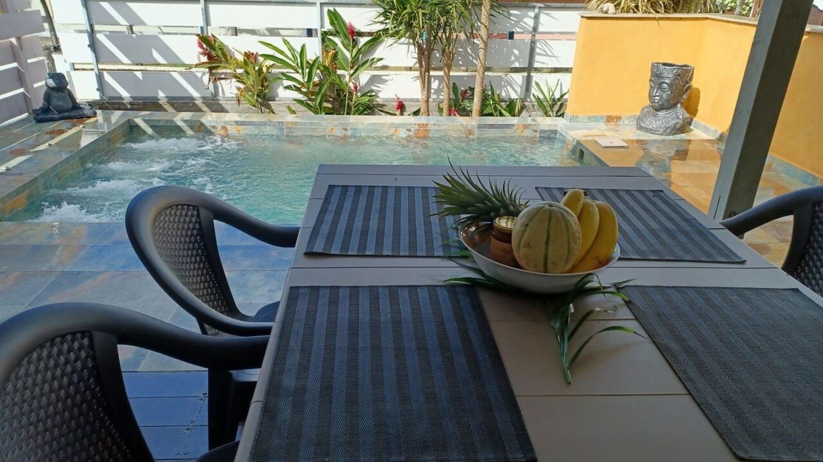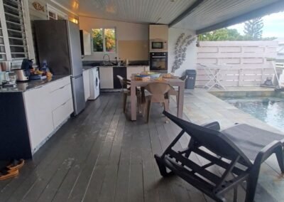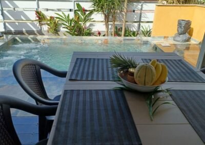 Terrasse aménagée propice aux repas en plein air et aux soirées tropicales